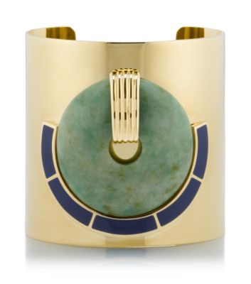 Jade and rose quartz were paired with enamel and set a stunning statement centerpiece with a shimmery gold backdrop. The design has an art deco element that makes it all the more attractive and a perfect partner with a casual summer chic outfit. Shiva Rose (Business Solutions)
